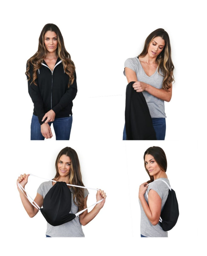 • Patented 2-in-1 hoodie converts into functional drawstring backpack in seconds