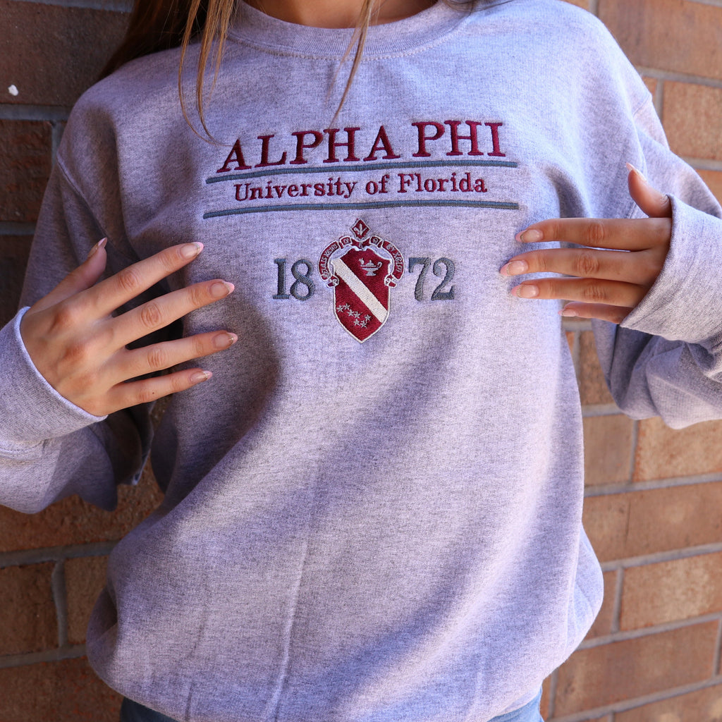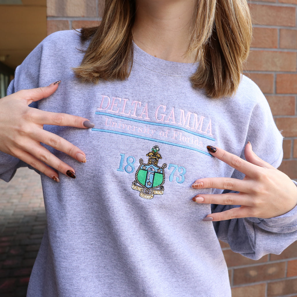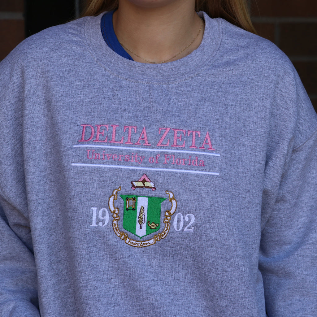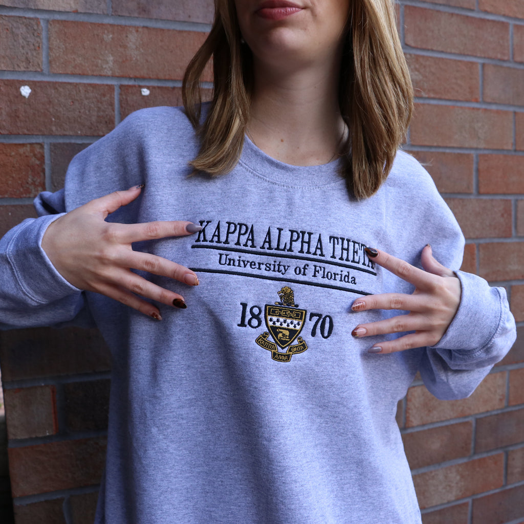 The Heritage crewneck showcases your sorority crest and school with an all embroidered front design.