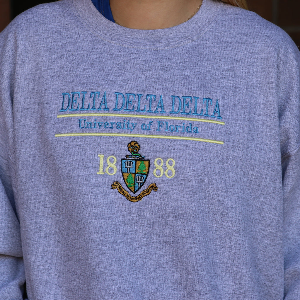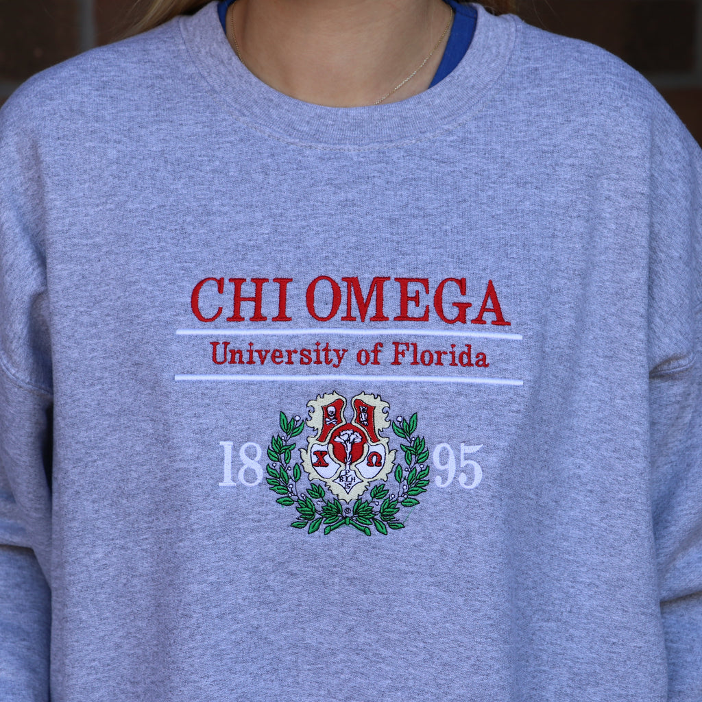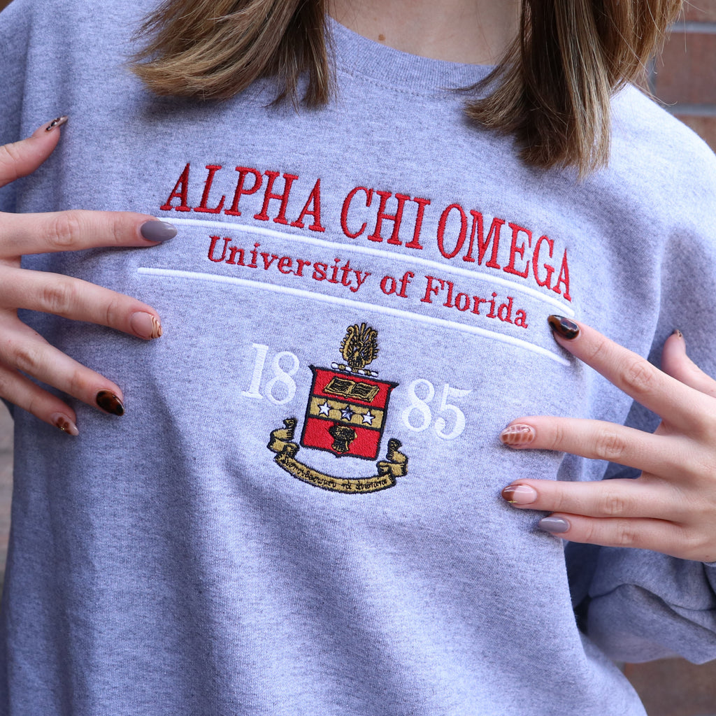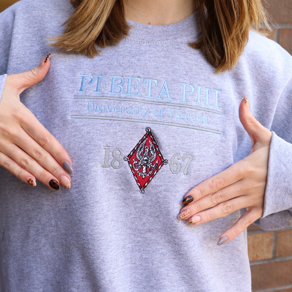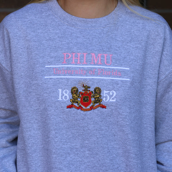 The Heritage crewneck showcases your sorority crest and school with an all embroidered front design.